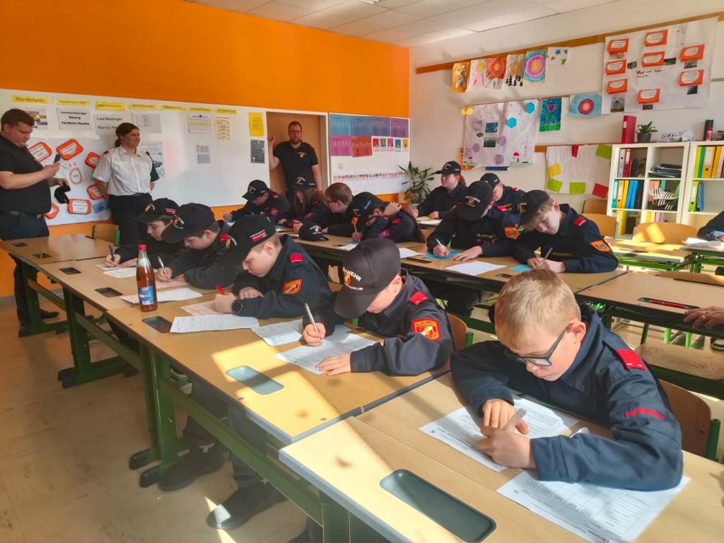 Unsere 8 engagierten Nachwuchs-Feuerwehrmitglieder stellten sich den Stationen: Testblatt, Dienstgrade, Knoten, Handfunkgerät, Geräte und Schutzausrüstung.